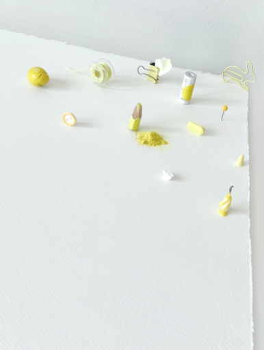 The "Obliquely" project proposes a different way of perceiving the familiar and explores the contemplation of anxiety and healing in daily life. Pale yellow serves as a timid warning, a color that stimulates tension and simultaneously heals psychological wounds. I color white paper entirely with pale yellow. Placing the paper, now transformed into pale yellow, on the desk, I diligently erase it with the eraser until it returns to its original white state. No matter how much I erase, traces of color remain, making it impossible to restore the paper to its original state. This work explores an ambiguous color, common objects easily found in everyday life that can always be replaced, and an inclined screen that has lost its balance, inviting us to glimpse our own reflections and convey the message that everything will be okay, even when things seem uncertain.