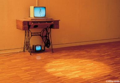 가장, 2Monitors, VCR, CC camera, Motor, Sewing Machine Case, Video Object, 100x85x43cm, 1996