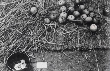 생김과 멸함, 1974 사과, 동전통, 짚멍석 가변크기 1974년 《한국실험작가전》 설치 전경